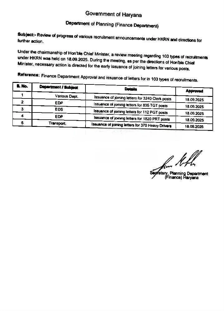 हरियाणा सरकार ने युवाओं के सरकारी रोजगार का सपना साकार करने के लिए बड़ा कदम उठाया है। 18 सितंबर 2025 को माननीय मुख्यमंत्री की अध्यक्षता में हुई समीक्षा बैठक में निर्णय लिया गया कि Haryana Kaushal Rozgar Nigam (HKRN) के तहत चयनित उम्मीदवारों को अलग-अलग विभागों में जल्द जॉइनिंग लेटर दिया जाएगा। अब क्लर्क, टीजीटी, पीजीटी, पीआरटी, हैवी ड्राइवर जैसे जरूरी पदों पर नियुक्ति प्रक्रिया तेज़ हो गई है—जिससे हजारों युवाओं को सरकारी नौकरी का सीधा लाभ मिलेगा
