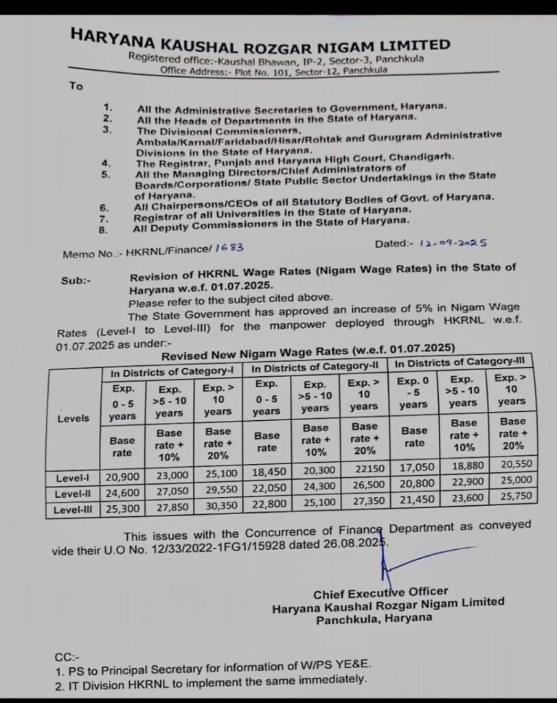 हरियाणा सरकार ने हरियाणा कौशल रोजगार निगम (HKRN) के 1.18 से 1.20 लाख कर्मचारियों को ऐतिहासिक तोहफा देते हुए 5% वेतन वृद्धि की घोषणा की है। यह फैसला 1 जुलाई 2025 से प्रभावी होगा, जिससे कर्मचारियों की मासिक आय में ₹900 से ₹1,200 तक की बढ़ोतरी होगी। मुख्यमंत्री नायब सिंह सैनी के नेतृत्व में लिया गया यह निर्णय राज्य सरकार के कर्मचारी-हितैषी रवैये को दर्शाता है
